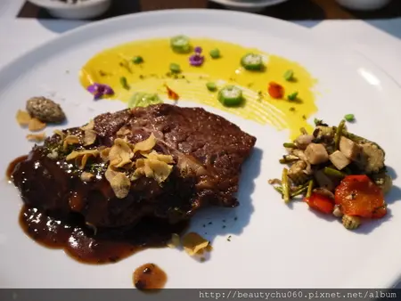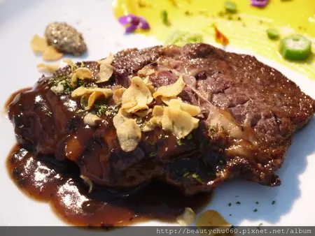 紅酒犢牛醬汁配上牛排香醇好對味~~還有超薄片的香煎蒜片提味