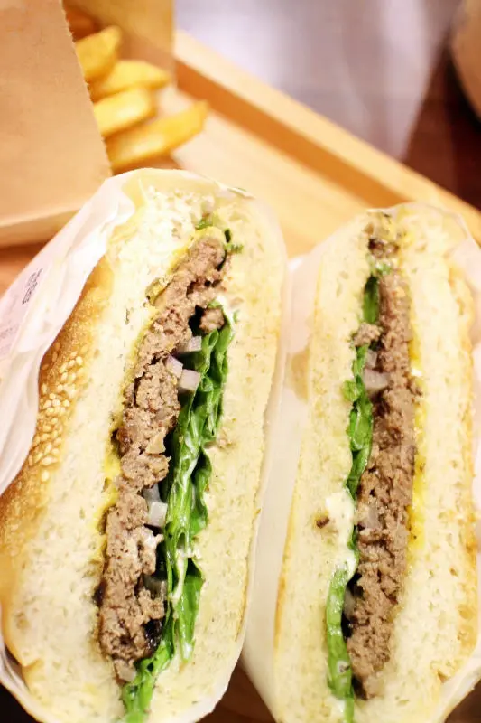 主廚很貼心先將比臉大漢堡剖半,帶著厚度的漢堡紙讓女孩吃漢堡也可以很秀氣