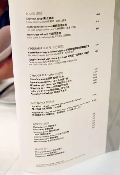 $1,480和$2,800的套餐提供相同的湯品,栗子濃湯佐歐芹、培根及蘋果 -