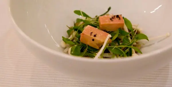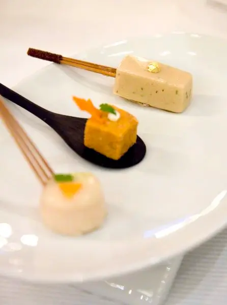 每份套餐都有的主廚精選小點,左方為白身魚肉鮮魚凍、中間為南瓜、右邊的是鮪魚,