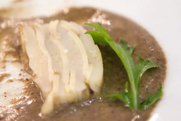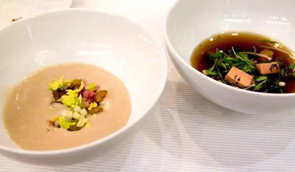 $1,900套餐的蘑菇澄清高湯,裡面有嫩煎鴨肝、嫩薑及芫荽 -