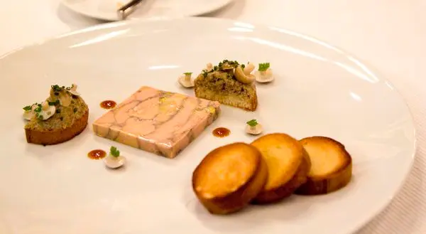 $2,800的套餐前菜,經典鴨肝晶凍佐醃漬鴻喜菇,搭配布里歐許麵包 -