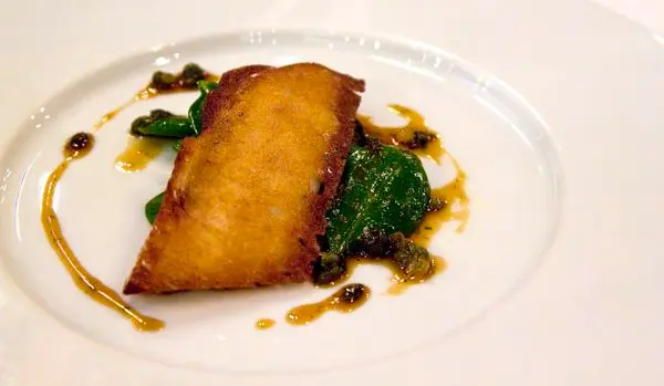 $2,800的套餐多了一道海鮮的前主菜,脆衣黃鰤魚佐嫩菠菜、酸豆及雞汁 -