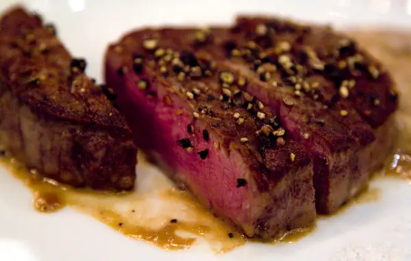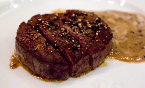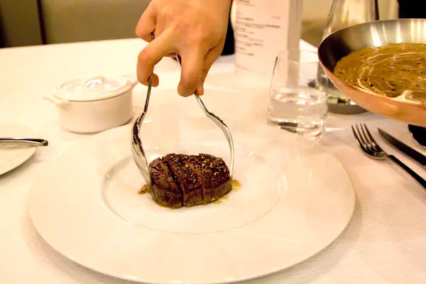 $2,800套餐主菜,巴黎風牛菲力搭配薯泥,由服務人員直接從煎牛排的平底鍋移至客人盤中 -