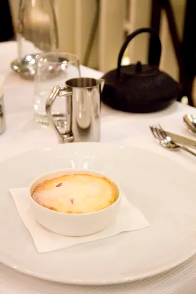 $1,480套餐甜點,檸檬舒芙蕾,一旁的銀色小壺裝有紅心芭樂及野生花蜜的淋醬 -