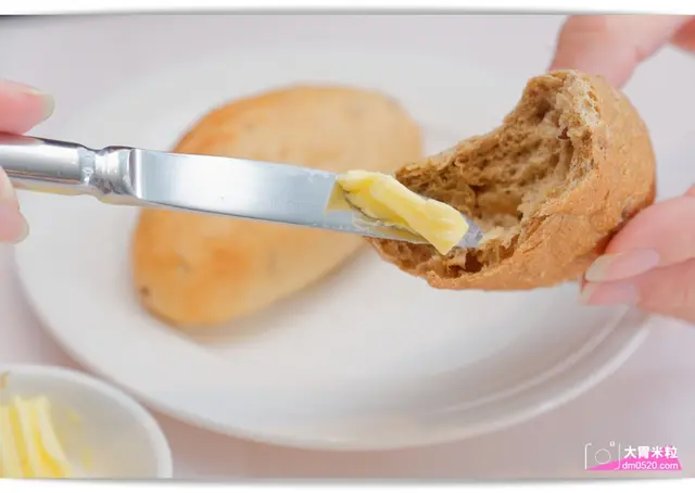 現烤的麵包抹上奶油後呈現半融化狀態,酥香脆口!
