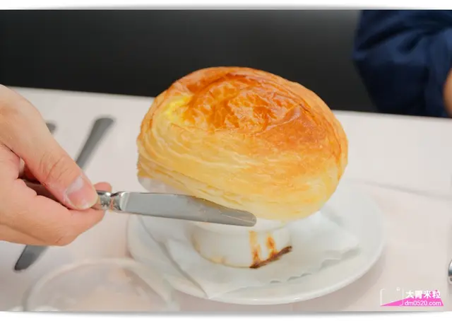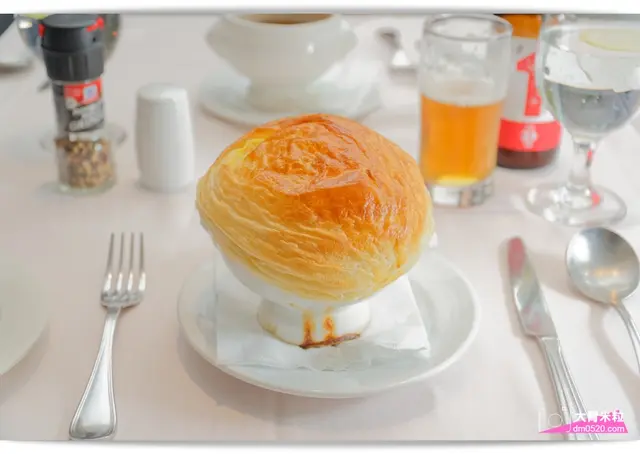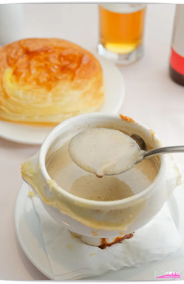 接著服務人員會用刀叉將上層酥皮放至盤中,品嚐時可另外放入湯內!
