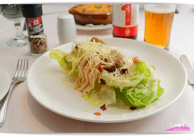 蘿蔓生菜配上帕瑪森起司與燻鮭魚,中間灑上自製培根碎片與麵包丁!