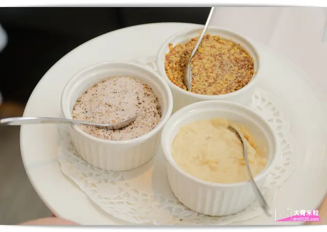 ▲三款醬料:芥末子醬/黑胡椒玫瑰鹽/辣根醬