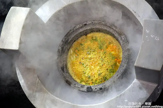 把砂鍋放在一個大鼎當中,所有的食材放在裡面再倒進熱熱的湯汁