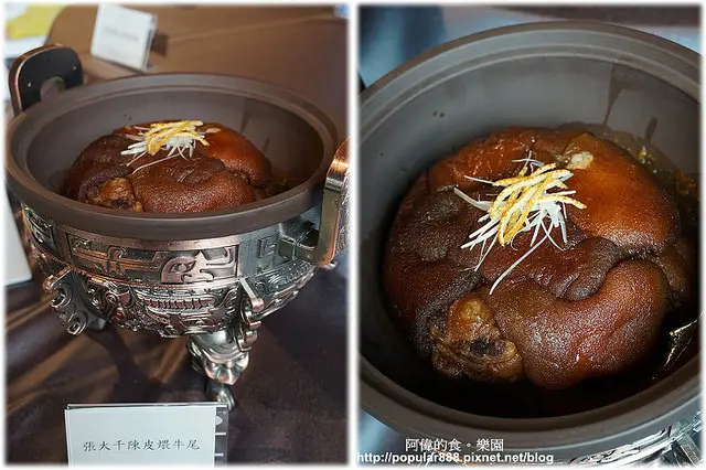 張大千是四川內江人,四川的飲食文化對他的影響尤為深遠。張大千的母親是個非常會做菜的人,父親也很懂吃,在這種環境中耳濡目染,為他後來成為美食家奠定了基礎。張大千常親自下廚做菜,一生都把烹飪當作一門藝術來追求,在他的眼裡,一個真正的廚師和畫家一樣都是藝術家。張大千常以畫論吃,以吃論畫。他喜愛吃牛肉,這道陳皮煨牛尾做法是先將牛尾燒過後炸,以八角、桂皮、陳皮等多種香料,加入芹菜、蒜頭、番茄、紅白蘿蔔一起燒煮,再加入蠔油、醬油、番茄醬以紅燒方式料理。