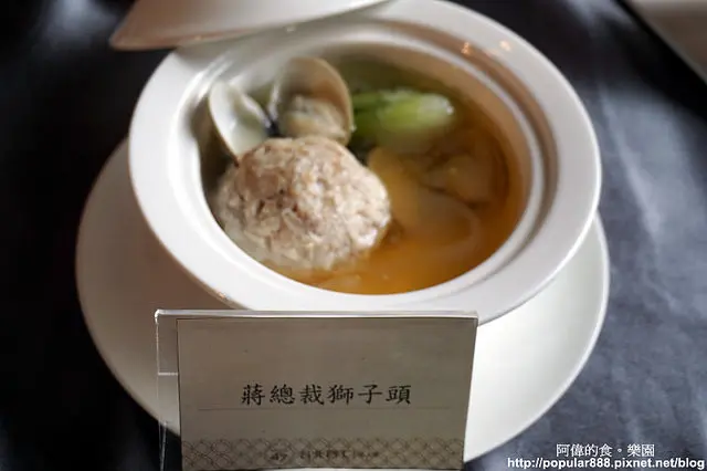 主廚選用肥瘦各半之的去皮五花肉,以手工剁碎增加肉質彈性,再加入了鹽、蝦子與瑤柱絲一同拌入,蒸3-4小時成型,再放入以豬皮、豬骨頭熬製高湯燉煮4小時使其入味,又因蔣公為奉化人嗜吃蛤蠣,師傅投其所好再加入蛤蠣燉煮,清澈湯頭更添獅子頭鮮甜度。