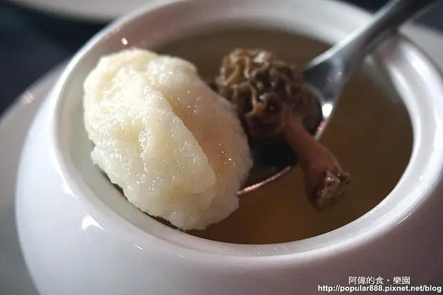 用羊肚蕈與竹笙一起燉煮的雞湯,既清澈也養生,湯中有濃濃的蕈菇香。