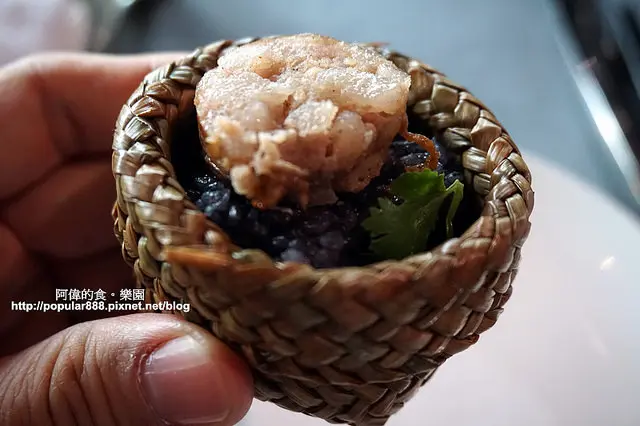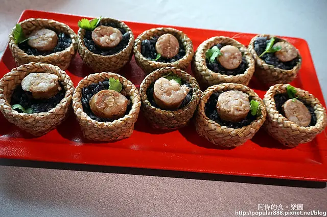 原來這不是"紫米"唷!是以泰國香糯米浸泡在烏樹汁,僅放入鹽調味而成,不過沒有什麼鹹味,咀嚼起來有種特別香氣。頂端的香腸帶著些肥油,讓口感更香,也很好吃。
