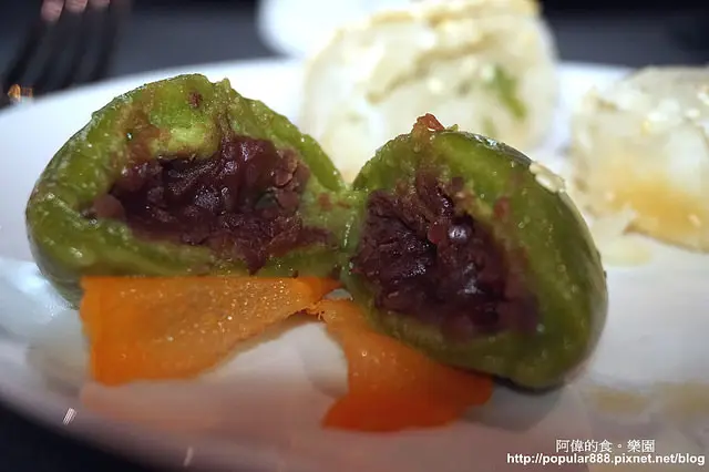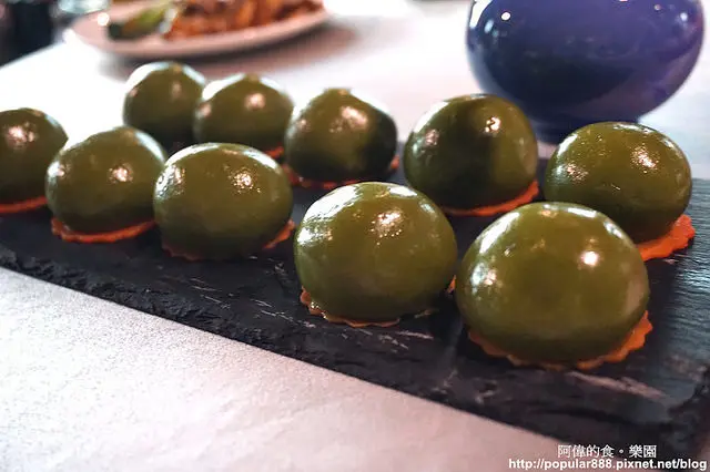 外皮的綠色是菠菜汁的顏色,麻糬的口感內餡是紅豆沙。