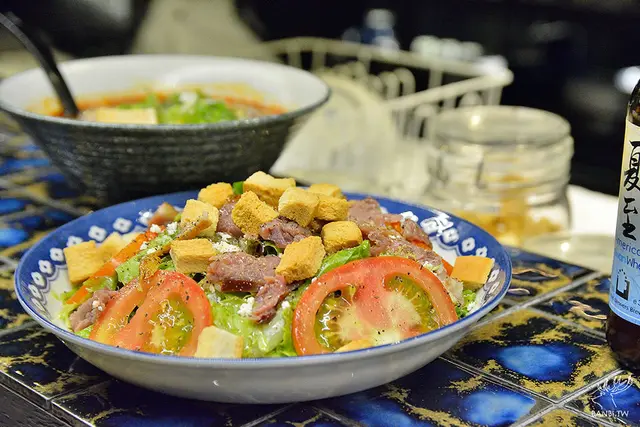 將宜蘭的名產鴨賞做成了西式的沙拉,搭配蘿蔓、番茄、起士、油醋醬、麵包丁,整體清爽,但總覺得有些可惜,若醬汁或是裡面的元素能更能融入台灣味點會較好,而非只有將肉類換成了鴨賞。