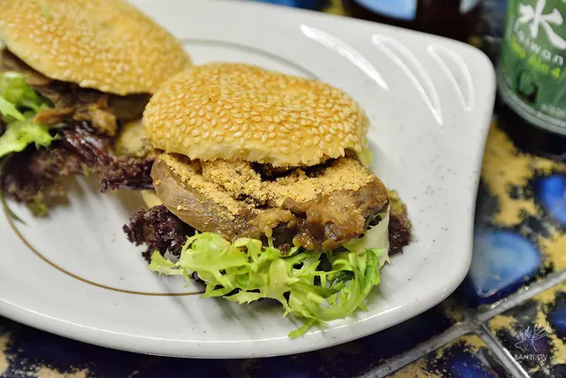 馬祖漢堡之稱的繼光餅在渣男的菜單也有出現,其特色就是硬實口感、充滿芝麻香氣,渣男包入了紮實的腱子肉、花生粉、豆乳醬與生菜,同行的朋友覺得繼光餅本身已經口感較硬,搭配也較紮實的腱子肉較沒那麼好入口,而我也覺得少了點香氣與軟嫩的口感來輔佐提升。
