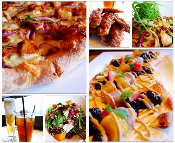 提供有 沙拉、開胃菜、薄厚披薩、燉飯、義大利麵、甜點、咖啡飲品、紅白酒、特調..等