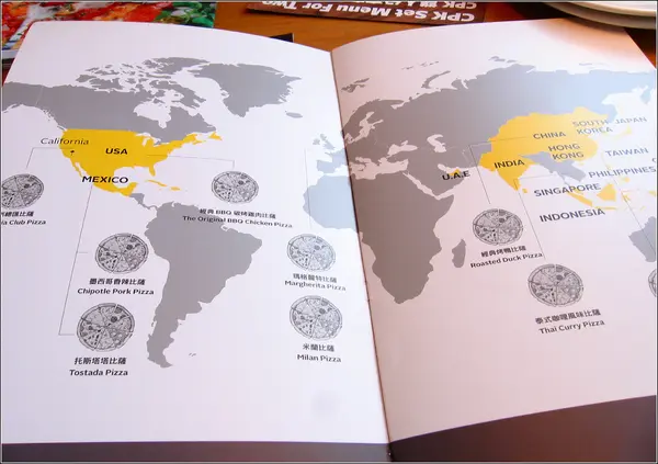 這一頁菜單是世界地圖呢~ 融合各國特色創造出各種不同pizza口味,用舌尖環遊世界挺酷的。