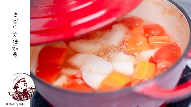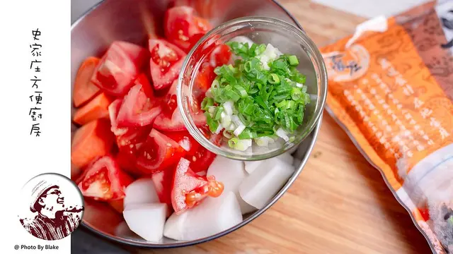在史家庄方便廚房清燉牛肉湯包裝後面就有說明怎麼料理,史家庄方便廚房清燉牛肉湯料理方式有四個步驟,但實際上只有兩個步驟,簡單到像我這種不常料理的人都會做了,首先要準備1200CC~1600CC,將已備好的切塊紅白蘿蔔放入煮到滾沸並且煮軟,因為白蘿蔔本身會出水,所以我個人是放1200CC的水為主,不敢放太多水主要是怕到時白蘿蔔出水後口味會比較淡一些,然後除了紅白蘿蔔外,還蠻強烈推薦可以放些蕃茄,湯頭會喝起來更有層次,在等水滾沸的同時,可以先切好蔥花備用,在最後成品灑上一點,味道會更香。
