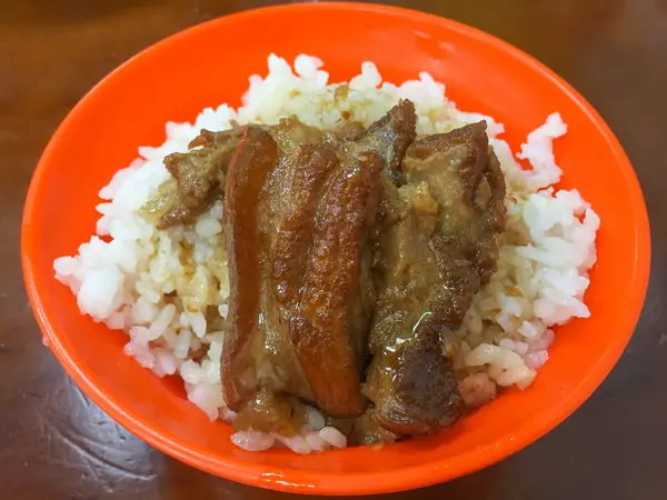 滷肉飯單加上一塊焢肉,有點像是中南部某些早餐的吃法?這塊焢肉比起底下的飯好多了,帶點甜,
