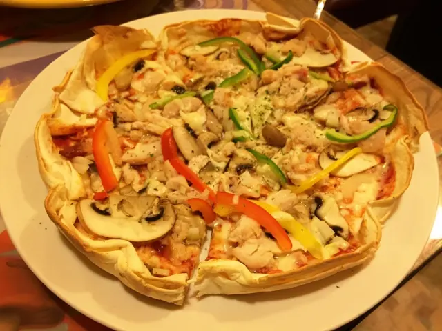 燻雞蘑菇披薩248元,是薄脆的餅皮,看到滿滿豐富的料就覺得很好吃,各色甜椒配色很美呢!