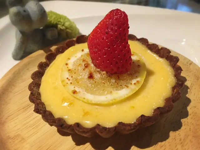 檸檬塔的塔底是有點巧克力口味的硬底子,脆脆的很好吃,上面放了一片檸檬還撒上糖粉,以及草莓點綴,整個豐富很多。