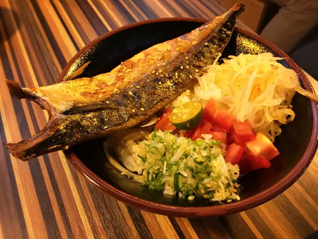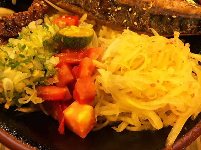 鯖魚烤得很香,皮酥酥的,肉還保有油脂軟嫩的口感,配上涼拌的青木瓜絲和蔥花,那番茄還用梅子醃過,我最愛這種梅汁番茄了!