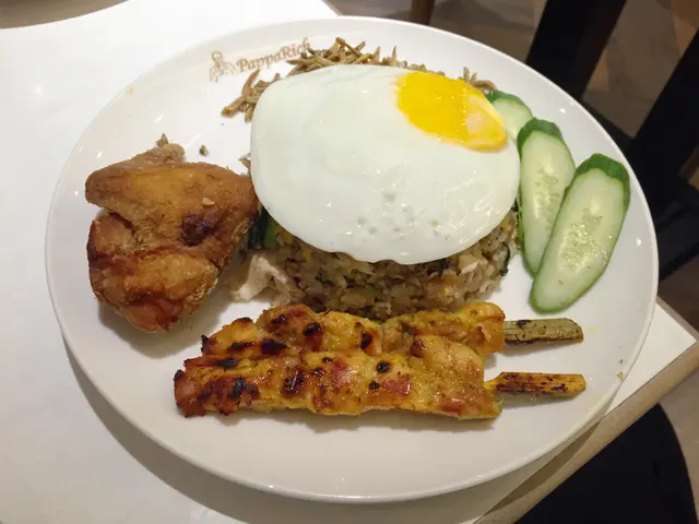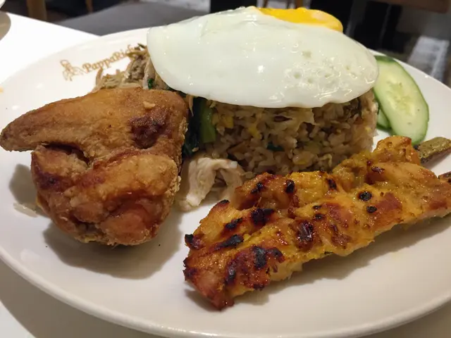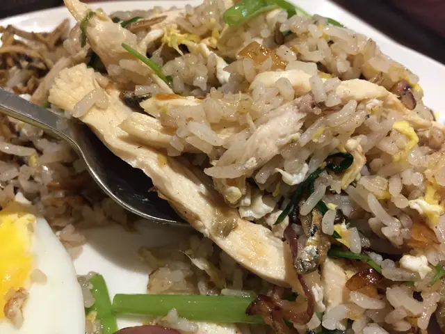 甘榜炒飯是肉絲炒飯,料還蠻多的炒飯,肉絲也明顯蠻大一條的,配上沙嗲和一個炸雞翅,還有一顆荷包蛋,整個看起來蠻豐富的。旁邊還附有像是炸過又炒過的小魚肝,脆脆的口感又重口味,非常的涮嘴,沙嗲味道也很入味,覺得吃完這一份就很飽又滿足了。