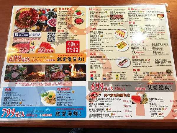 菜單超豐富的,除了吃到飽之外,還有個人套餐喔!沒想到一個人也可以來吃燒肉,真是顛覆大家對燒肉刻板的想像耶~我們來吃就是要吃到飽又吃到爽的!價位從699到899都有,主要的差別在於肉品和海鮮,可以依自己喜歡的口味挑選,第一次來就是要吃好吃滿,直接來899吃到飽囉!
