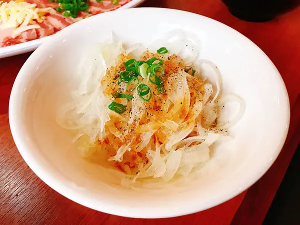 首先來兩個小菜,我最愛的韓式泡菜和和風洋蔥沙拉,我覺得這種涼拌小菜搭配燒肉味道很棒,吃起來也比較清爽,忍不住泡菜吃了好幾盤。