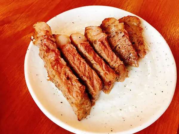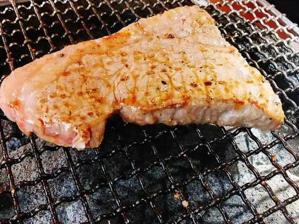 我是個喜歡每種口味都嚐嚐的人,看到這裡的有這麼多種不同的肉類,實在讓人食指大動啊!現在就來跟大家介紹我覺得一定要吃的必點吧~一般去吃到飽的燒肉,很少有整塊牛排的吧?!這裡竟然有厚切熟成牛排,完完整整的一整塊,而且我本來還擔心會不會不好烤或是烤起來不好吃,服務人員非常貼心的來幫忙烤,還看了一下我們喜歡的熟度,說實在看起來真的不難烤,而且烤好之後,用剪刀剪成一塊一塊的放在小盤子裡享用,有種在鐵板燒吃牛排的感覺,這大約七分的熟度,吃起來嫩嫩的很剛好,旁邊還有海鹽可以提味,算是好吃的牛排耶!而且感覺吃到牛排就很划算,喜歡的人可以多點幾塊啊~