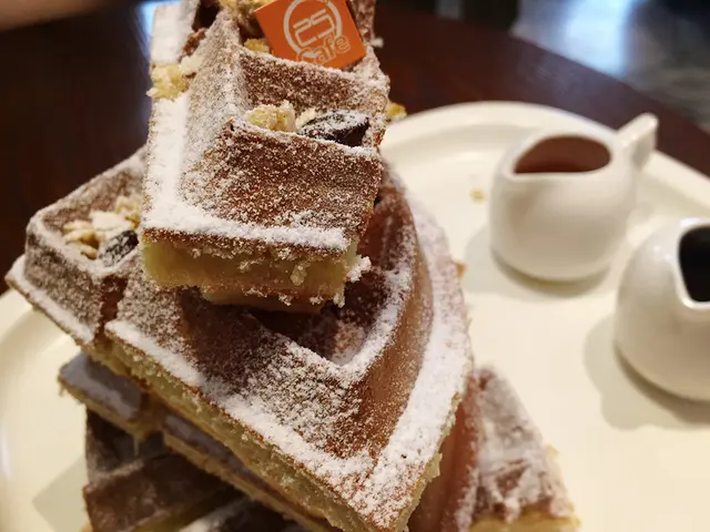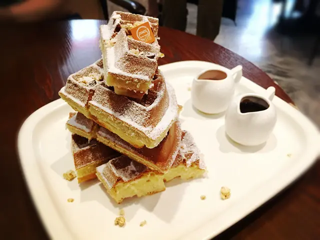 鬆餅很貼心的都已經切塊,還很有趣的堆疊成塔,灑上一些糖粉,食用的時候很方便。