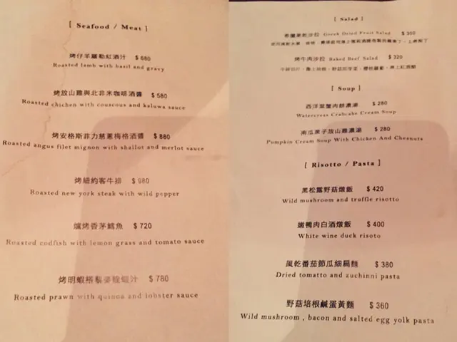 我們是來吃晚餐的,服務人員介紹了一下菜單,餐點都是單點的,主要有義大利麵、燉飯、排餐還有早午餐等等。