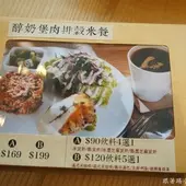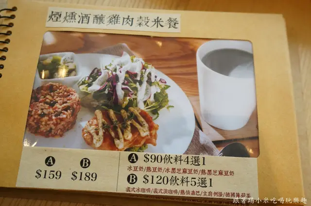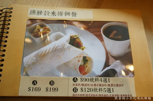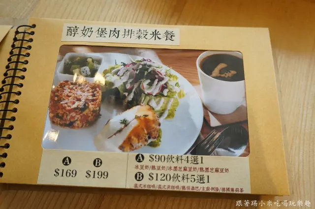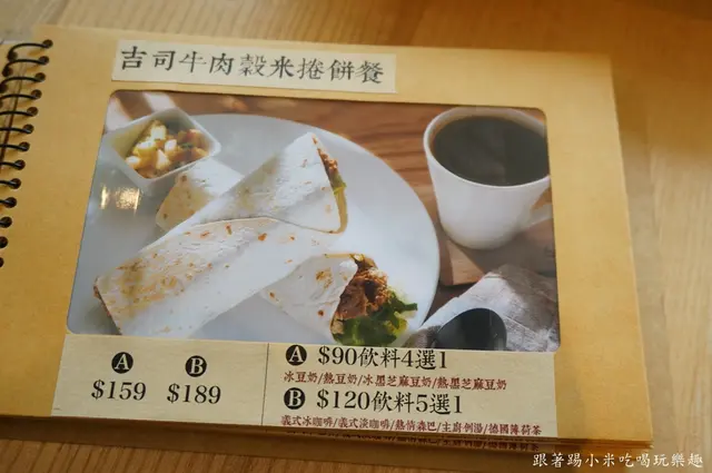 小米和友人點了兩個套餐, 分別是煙燻酒釀雞肉穀米餐A餐159元(熱黑芝麻豆奶) 及 吉司牛肉穀米捲餅餐 B餐189元(義式淡咖啡)