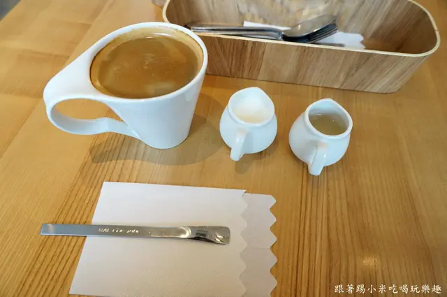 義式淡咖啡其實一點都不會淡, 咖啡甘苦味表現蠻濃的, 在甘苦中偏酸, 不喜歡喝酸咖啡的朋友建議點別的, 另外附上的是牛奶不是奶精唷, 健康度有加分, 而且加了牛奶後會變成微酸及順口一點~