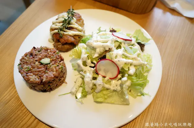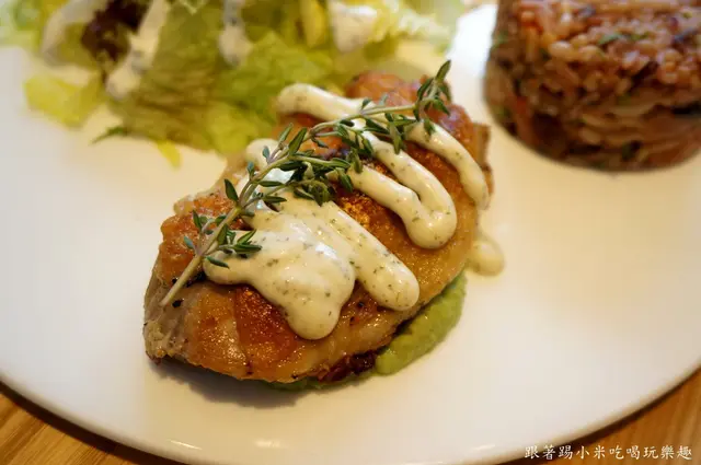 雞腿排的皮煎得很酥脆, 沾上微甜沙拉醬還不錯吃, 肉質也很軟嫩, 這個餐點整體水準讓小米有一點點小驚艷, 雖然是輕食套餐, 卻不會平凡且有自己特色, 不油少鹹卻不會覺太清淡, 這個是小米值得一堆套餐唷