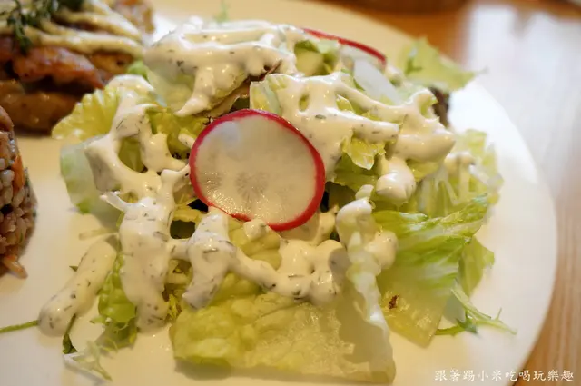 蔬菜沙拉小米選了凱撒醬, 蔬菜表現上很新鮮, 口感上會吃到咔滋咔滋爽脆的蔬菜, 微甜的凱撒醬還不錯吃, 有醒胃的作用
