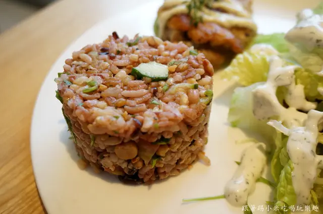 多穀米不只是五穀, 還有加了小黃瓜及青蔥, 是有嚼勁及帶一些些輕脆口感的雜糧米飯, 小米還有吃到微微酸醋味道, 讓這個雜糧飯不會乾澀