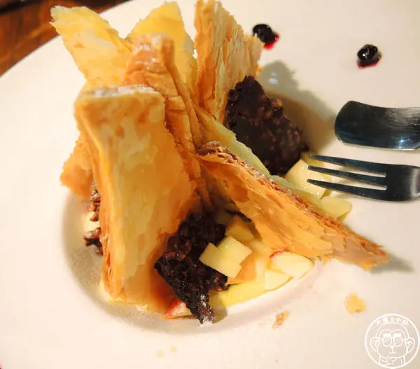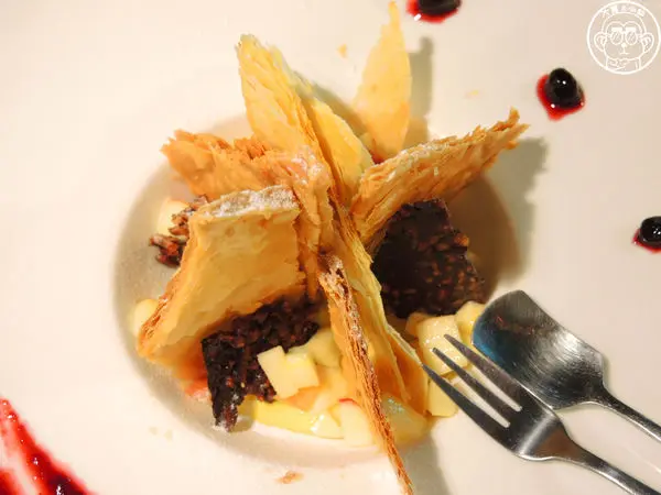 乍看還真不知道該怎麼下手,經講解才明白是要拿著千層餅乾沾卡士達醬吃