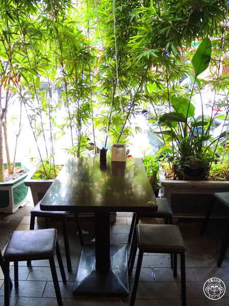騎樓下有綠意相伴的用餐區,我們被安排在顏色鮮明的方桌
