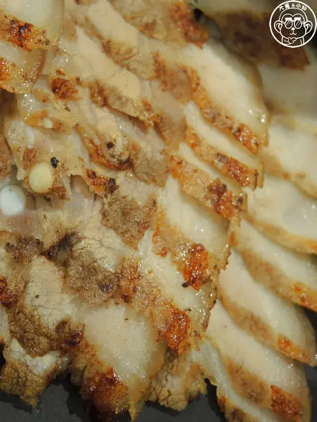 片片豬肉的紋路好漂亮,外皮酥烤的鹹豬肉單吃就很有味道