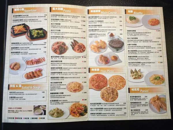 從開胃小點、沙拉&湯、義大利麵、燉飯、排餐和薄餅都找的到