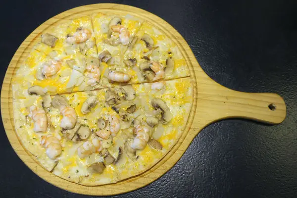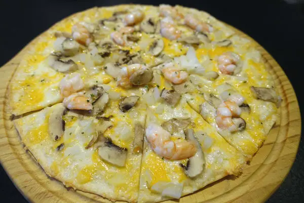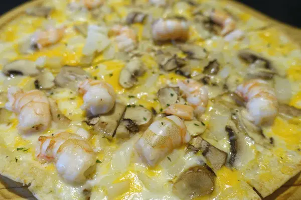 上頭有紅蝦、蘑菇、洋蔥和起司三巨頭 傑克、查特 帕馬森起司,