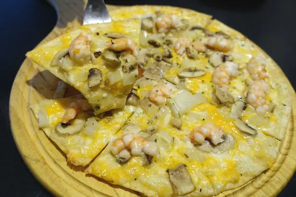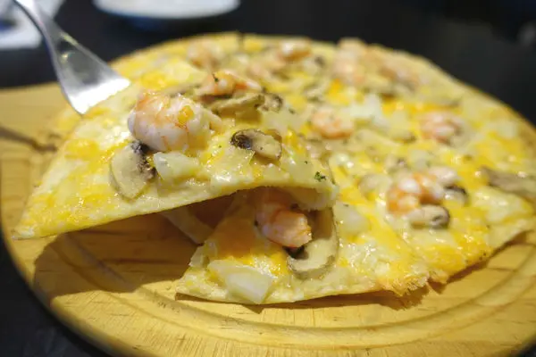 吃起來涮嘴,灑滿整片餅皮的鮮蝦起司薄餅;