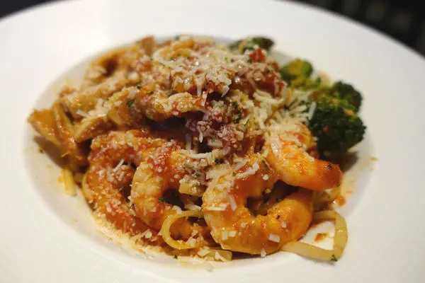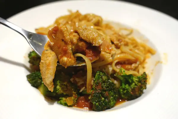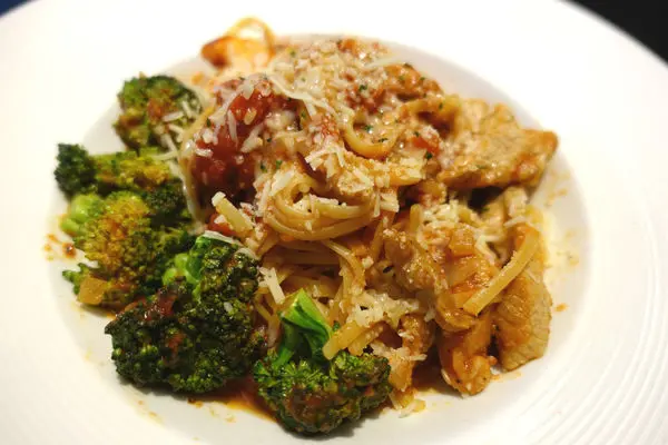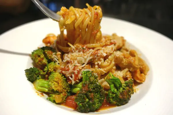 肉類由松阪豬和鮮嫩蝦當道,佐以花椰菜和番茄紅醬,