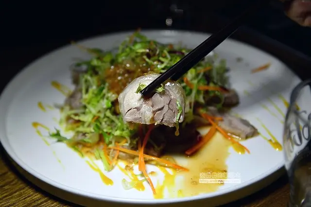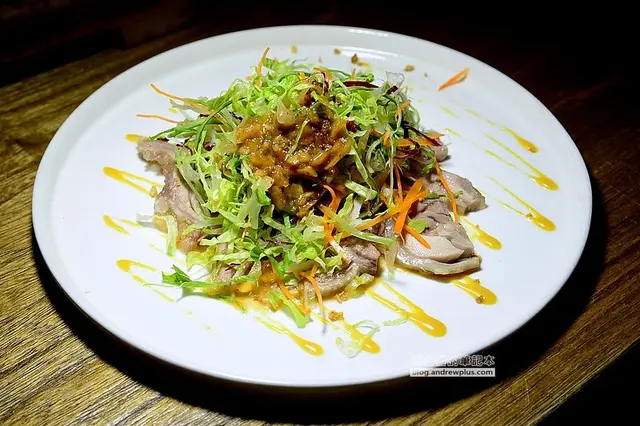 除了新鮮的精釀啤酒可以喝,這裡的菜色也相當不錯!雞腿肉使用店內自釀啤酒醃製,淡淡酒味不像醉雞那麼濃,配上生菜和帶有胡麻、金桔自製醬汁,是道清新爽口的料理