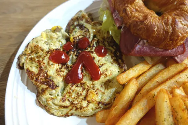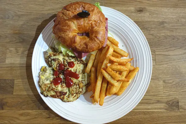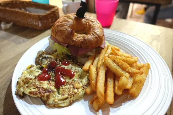 不只有一份大型可頌,還附上歐姆蛋和薯條,CP值蠻高的唷