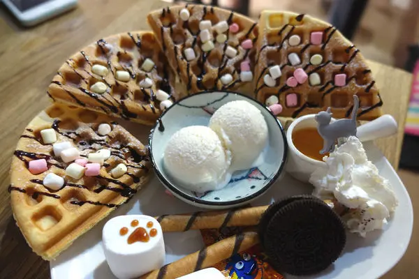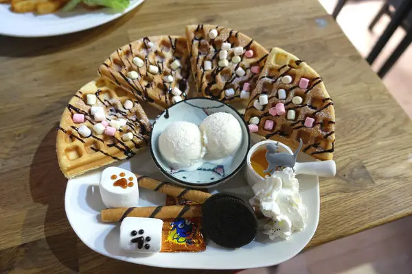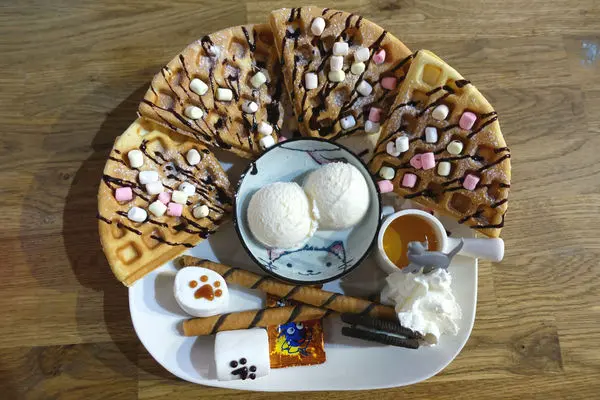 原味鬆餅加上自製冰淇淋的喵吧鬆餅($120)。