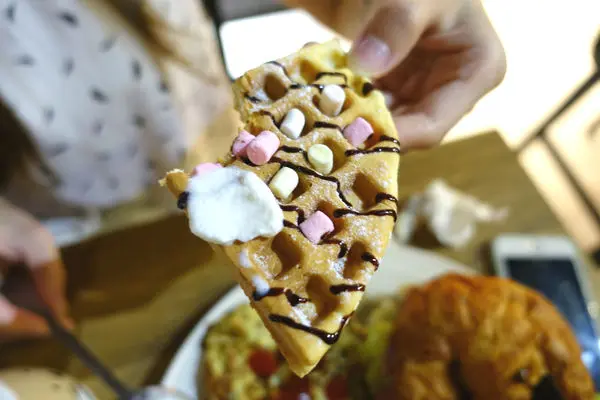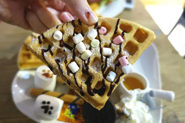 切成四等分的鬆餅上灑滿紅黃白交錯的棉花糖粒和巧克力醬唷,
